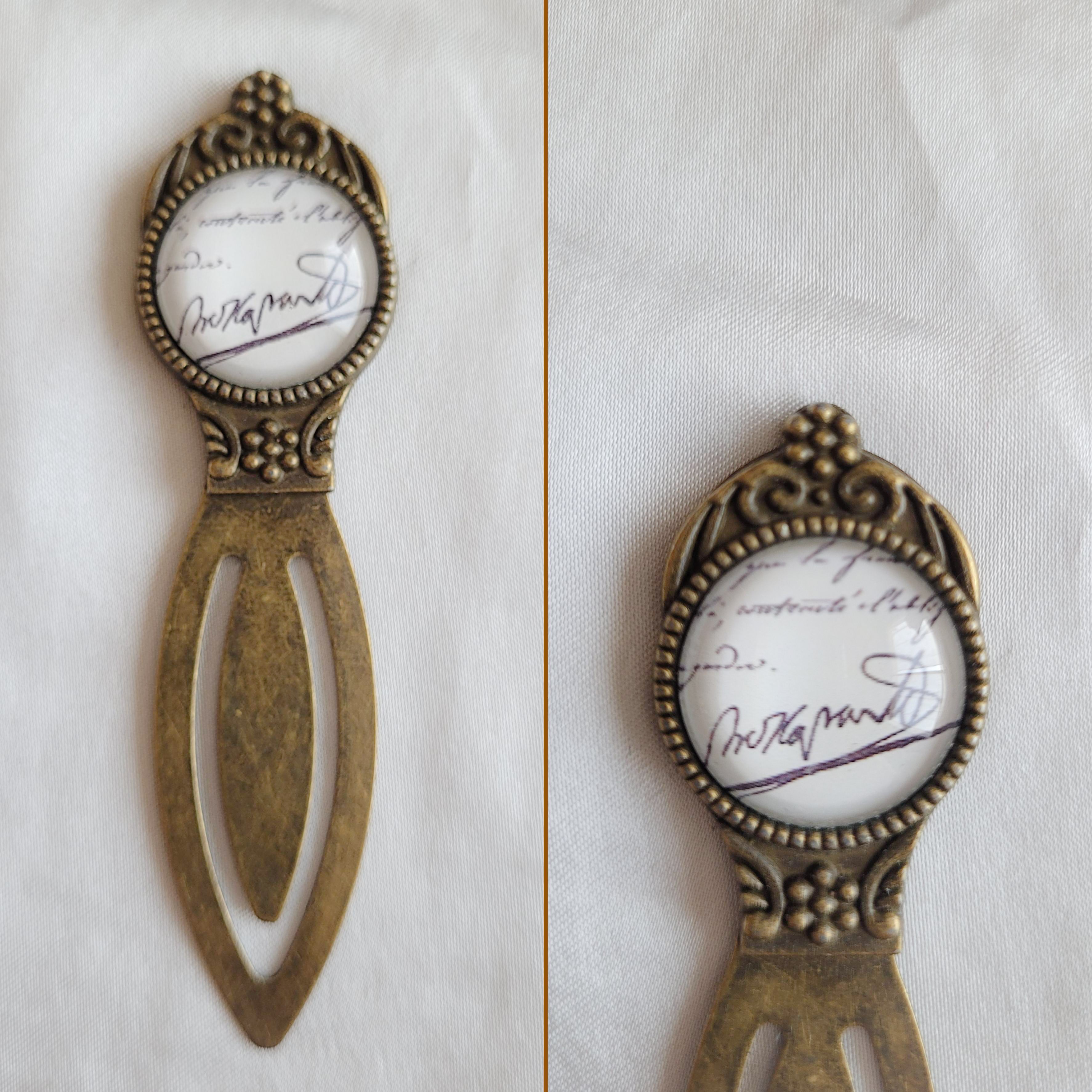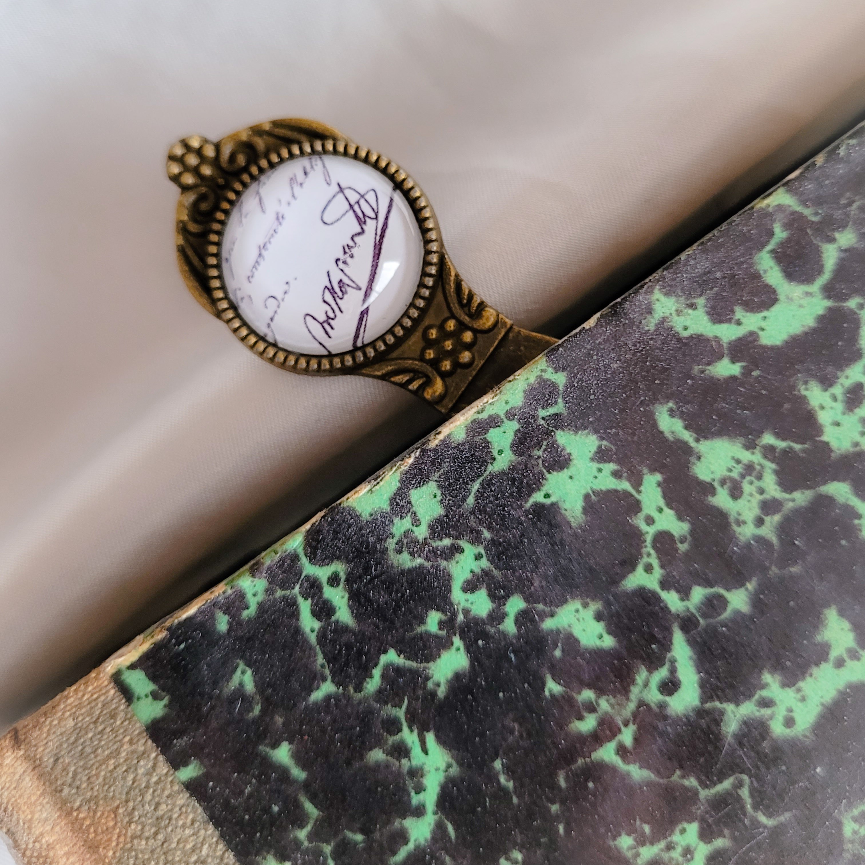 Marque page de couleur bronze surmonté d'un globe de verre de 18 millimètres.