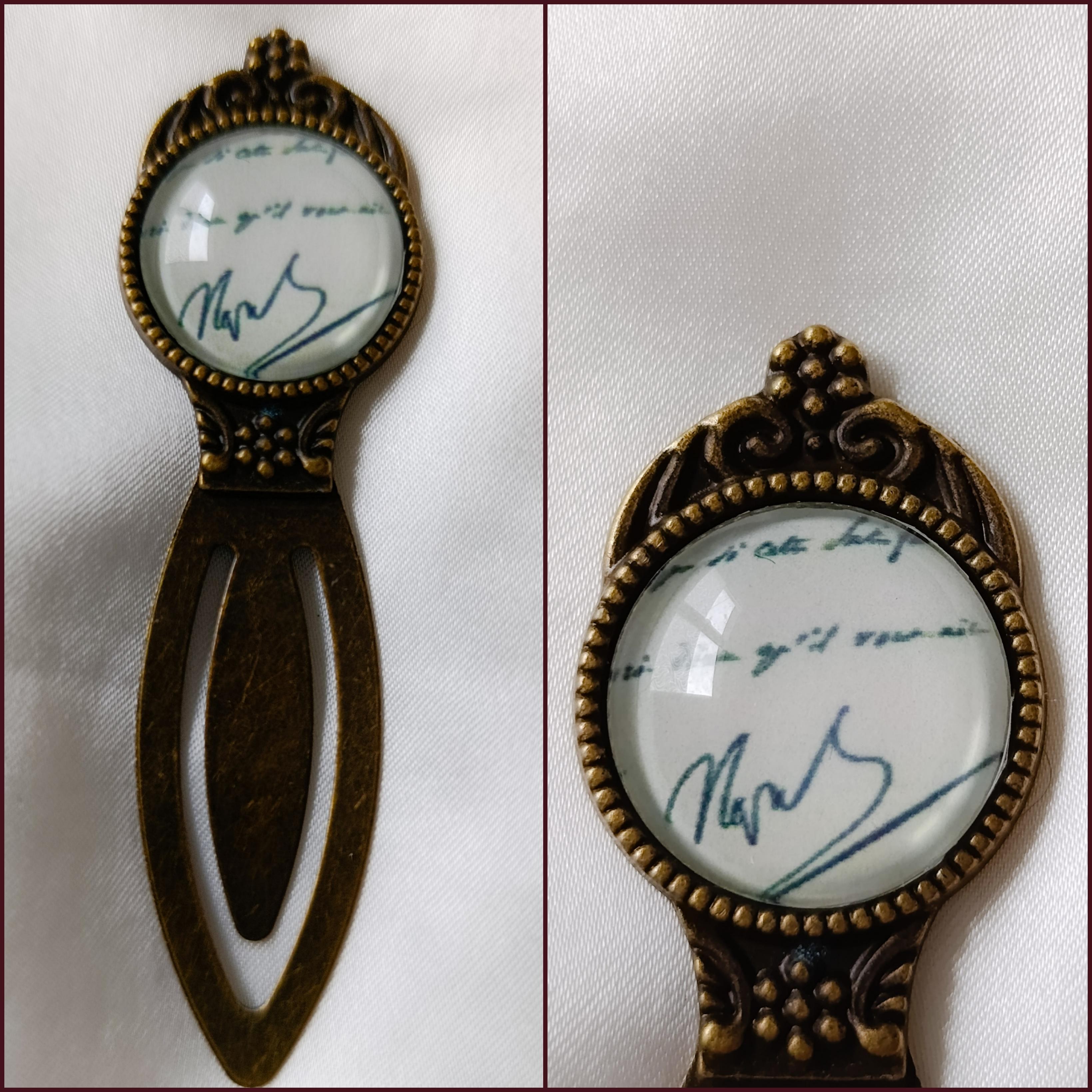 Marque page de couleur bronze surmonté d'un globe de verre de 18 millimètres.