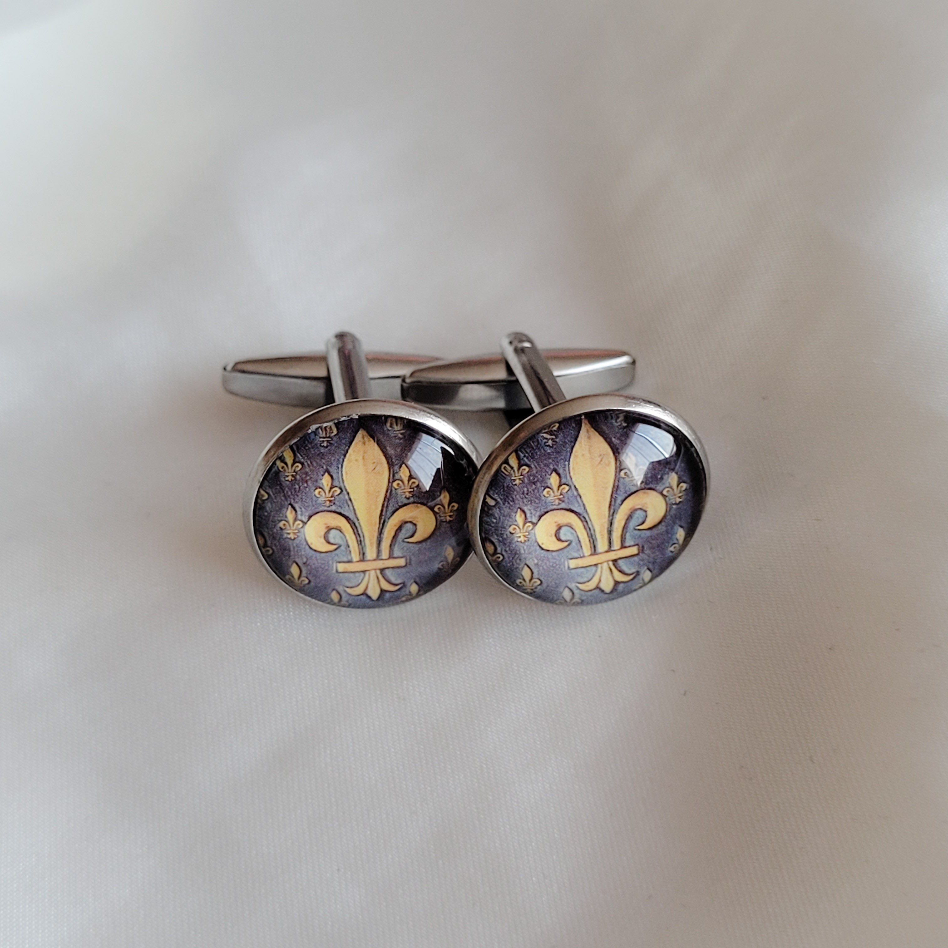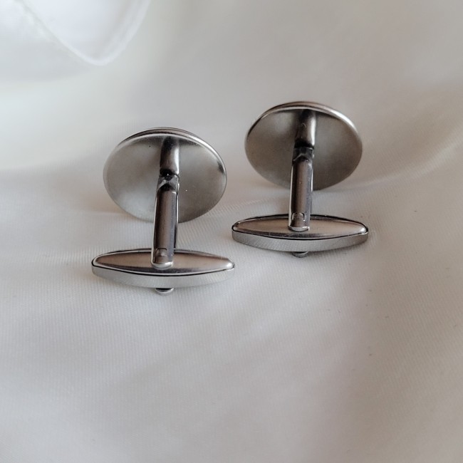 Boutons de manchettes argentés surmontés de globes de verre de 16 millimètres de diamètres. L'image est une création « L'Abeille ».