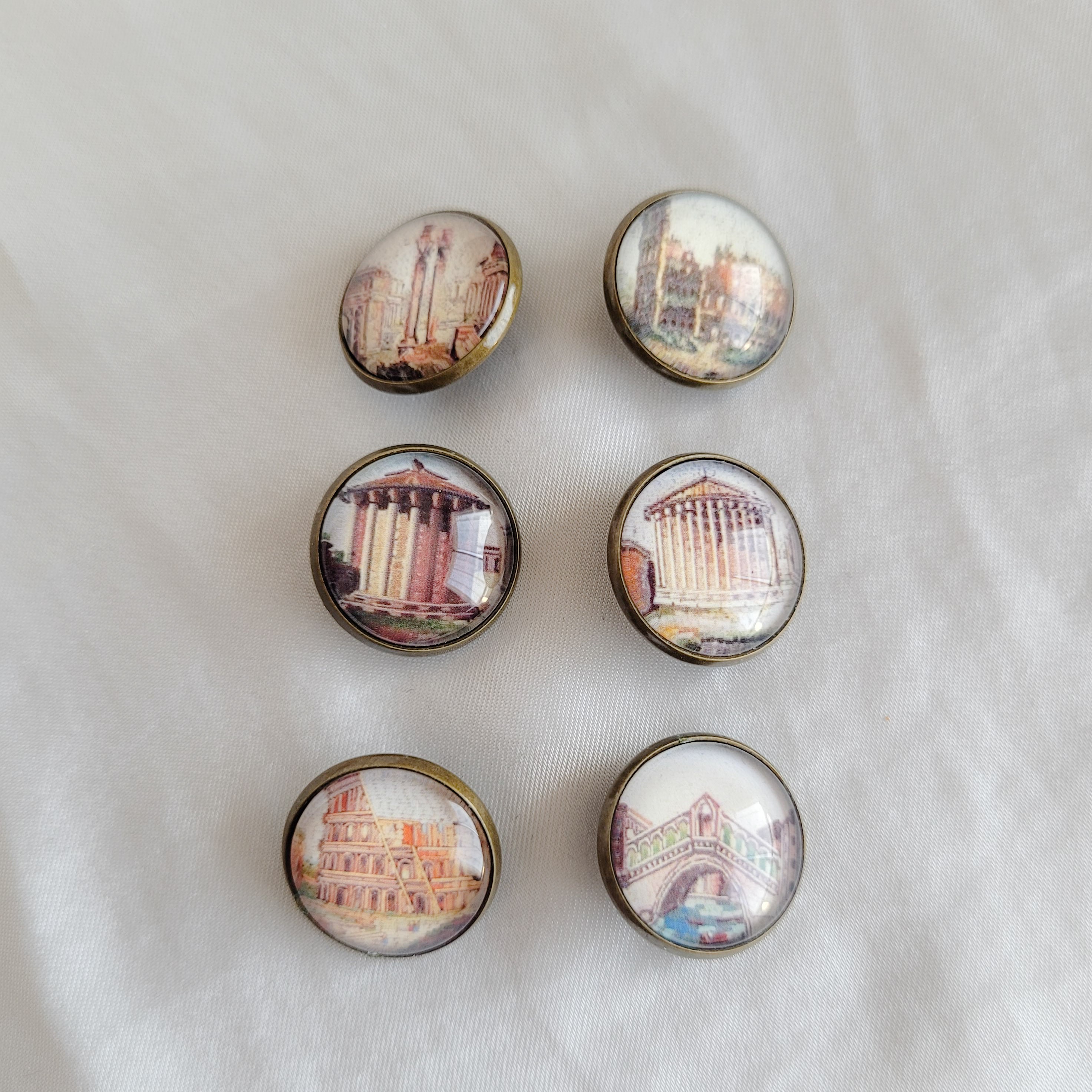 Lot de six boutons doré en métal surmonté d'un globe de verre de 16 millimètres. Les modèles sont d'inspiration historique repris de boutons du XVIIIe et XIXe siècle.