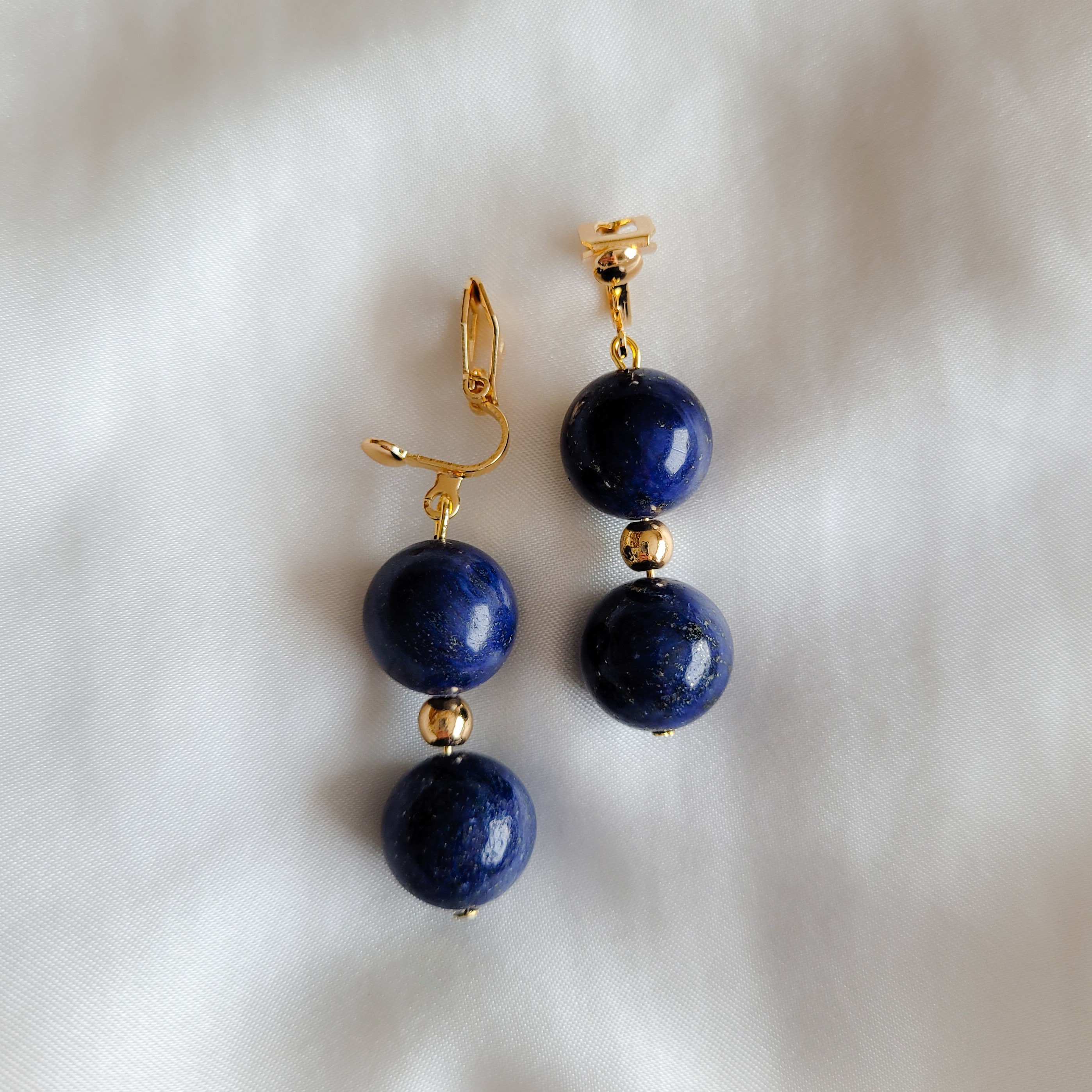 Boucles d'oreilles en plaqué or et perles de lapis lazuli de 12 millimètres séparées par une perle de 4 millimètres.