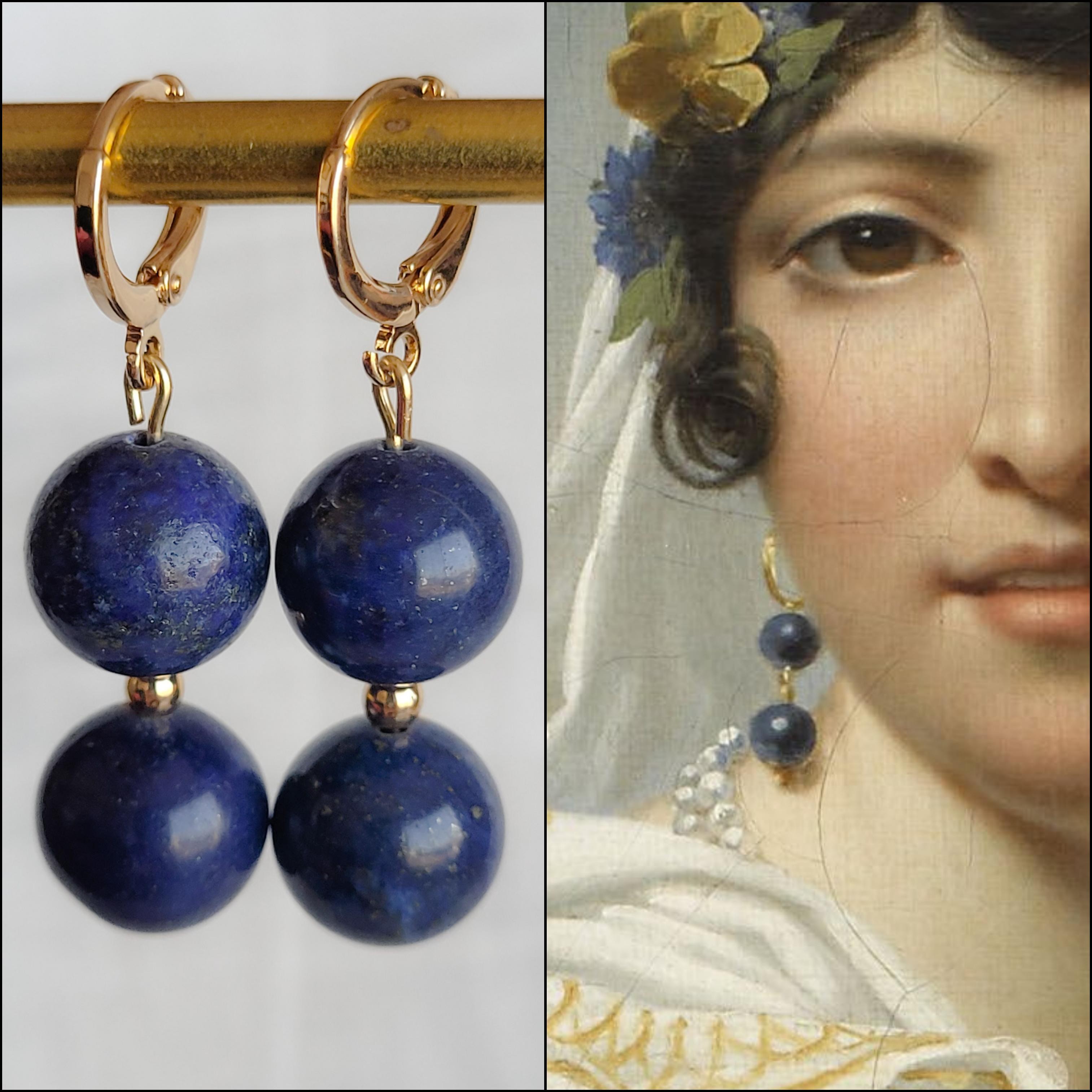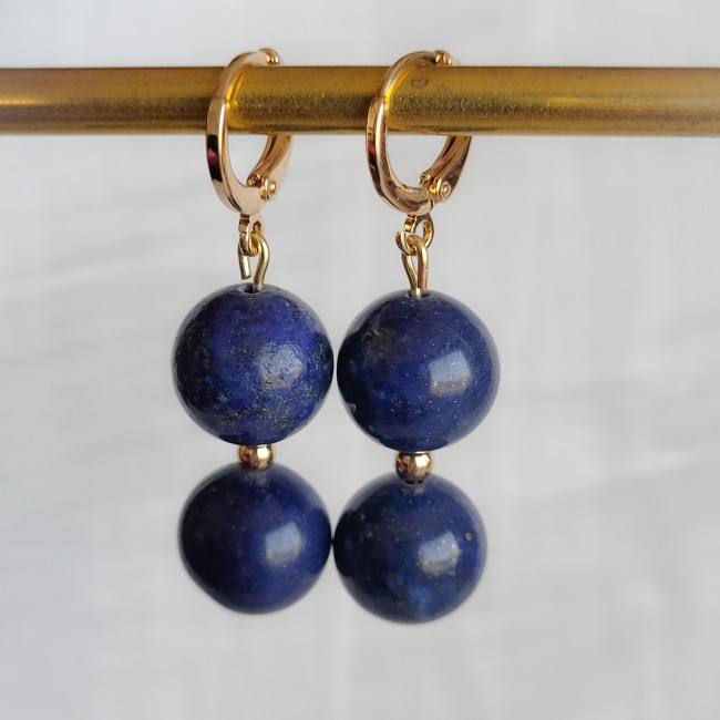 Boucles d'oreilles en plaqué or et perles de lapis lazuli de 12 millimètres séparées par une perle de 4 millimètres.