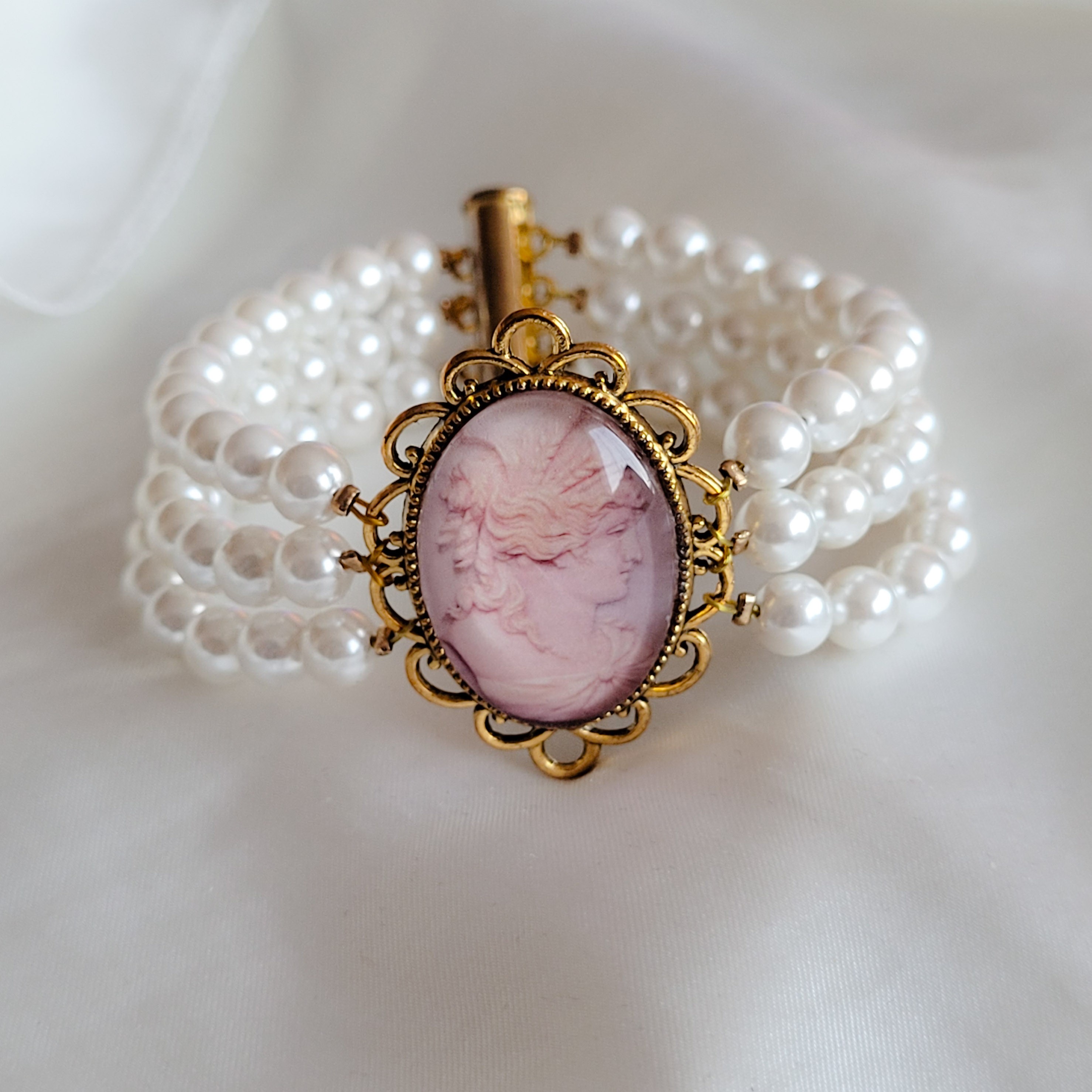 Très populaire sous le Premier Empire, ce bracelet en perles de coquillages entoure un support de cabochon en métal doré. Le cabochon surmontant le support mesure 1,8 x 2,5 cm.