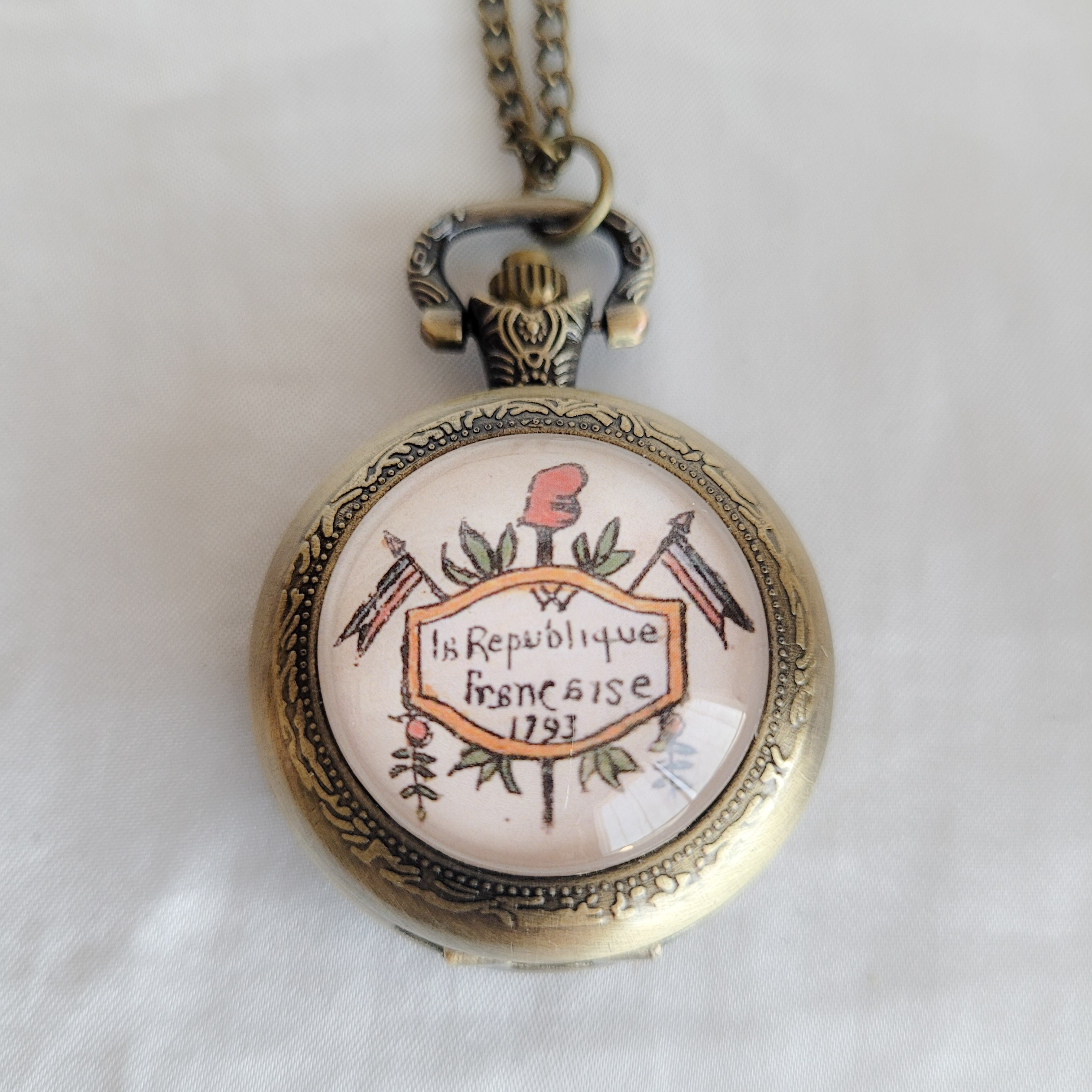 Montre à gousset de couleur bronze surmontée d'un globe de verre de 25 millimètres de diamètre. L'image utilisée est issue d'un bouton de la fin du XVIIIe siècle.