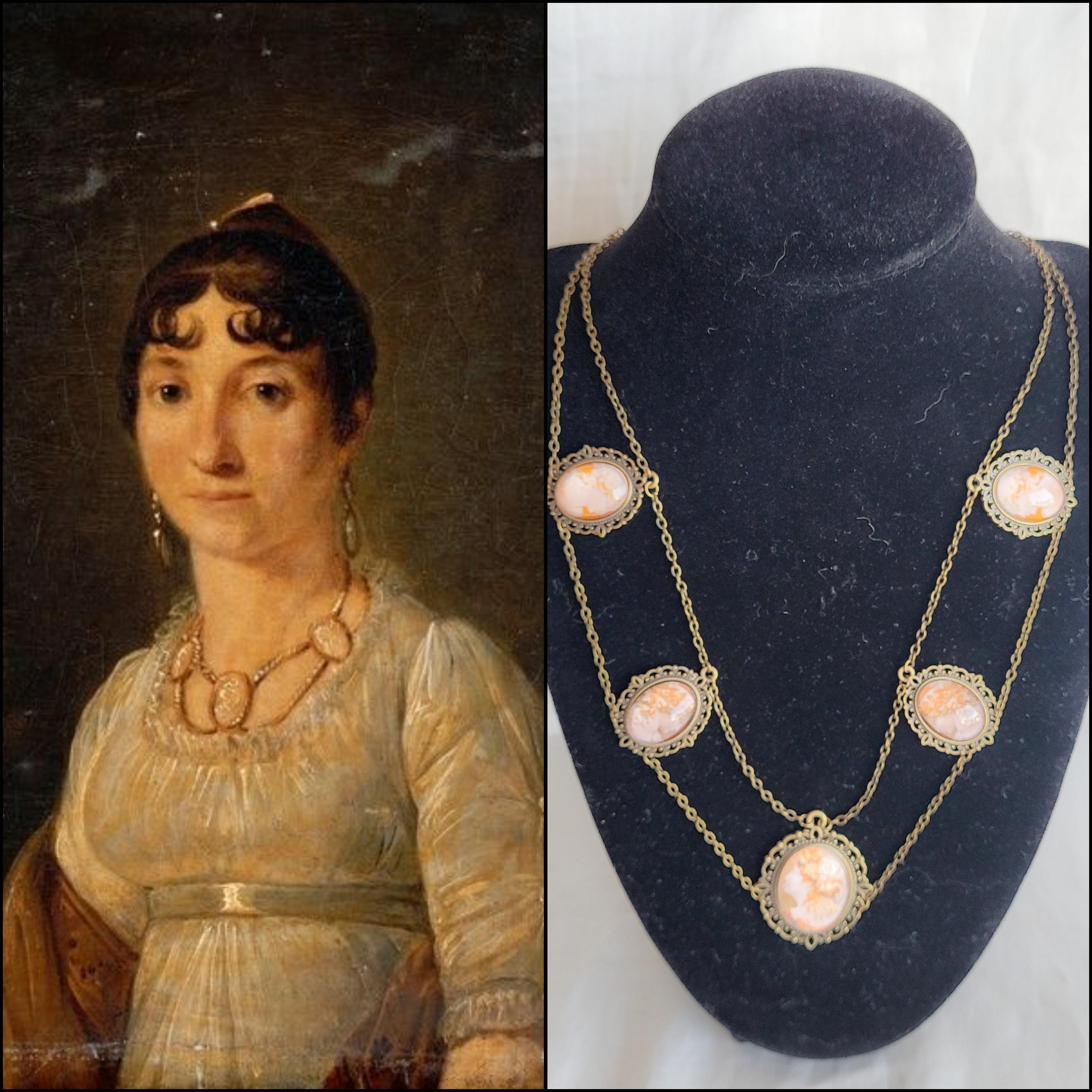 Les camées qui ornent le collier sont des camées tirés de bijoux de la première moitié du XIX ème siècle.
