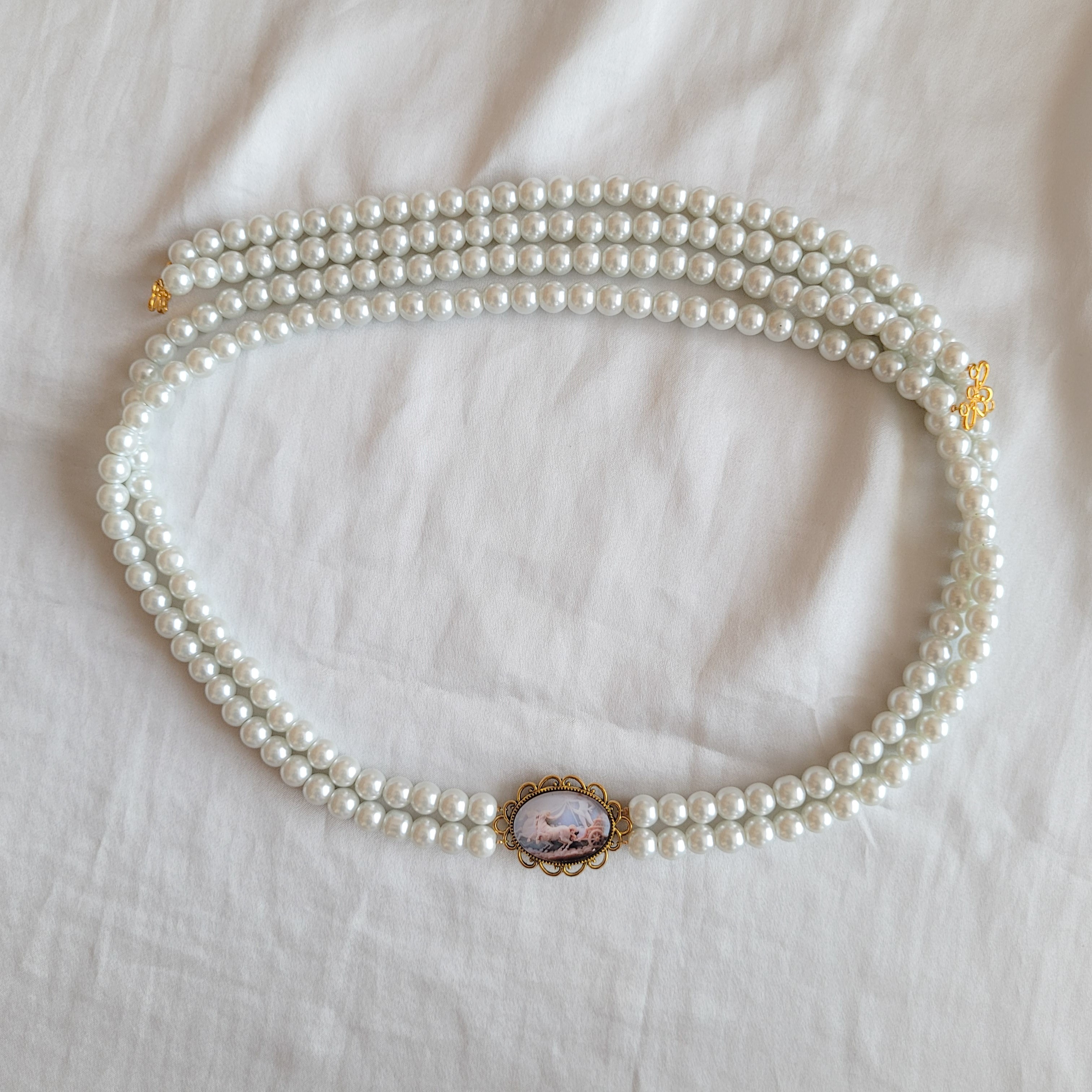 Ceinture en perles de verre imitation perle de 8 millimètres surmontée d'un cabochon d'inspiration camée mesurant 25x18 millimètres.
