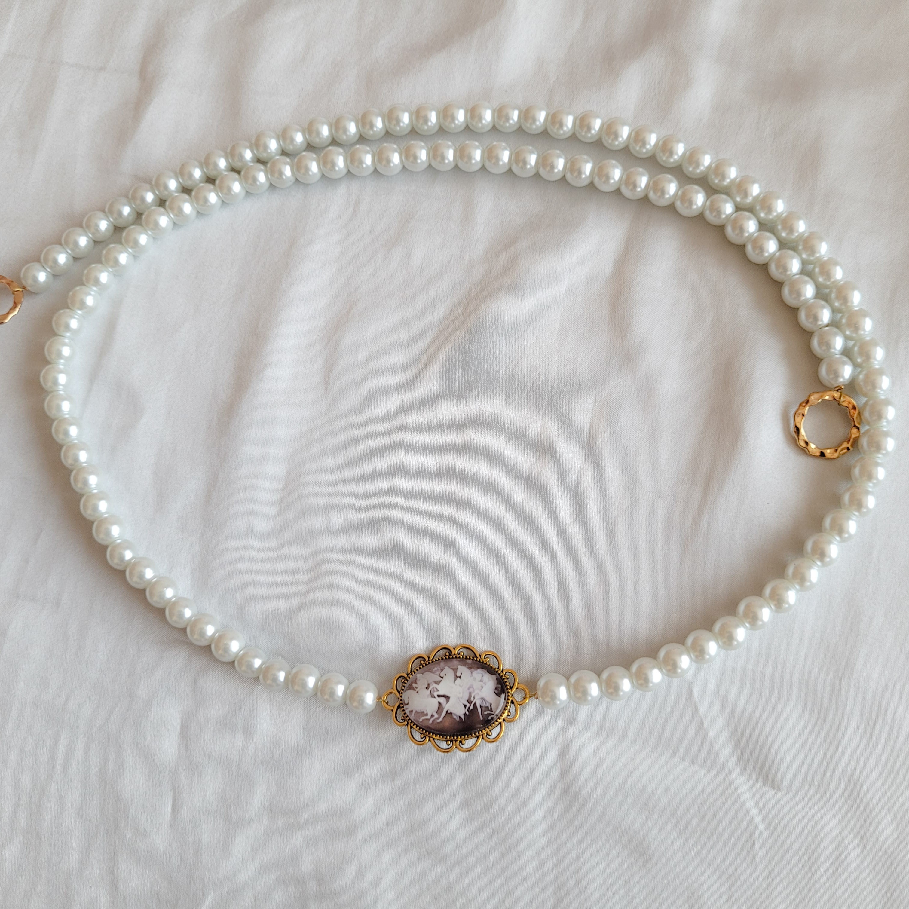 Ceinture en perles de verre imitation perle de 8 millimètres surmontée d'un cabochon d'inspiration camée mesurant 25x18 millimètres.