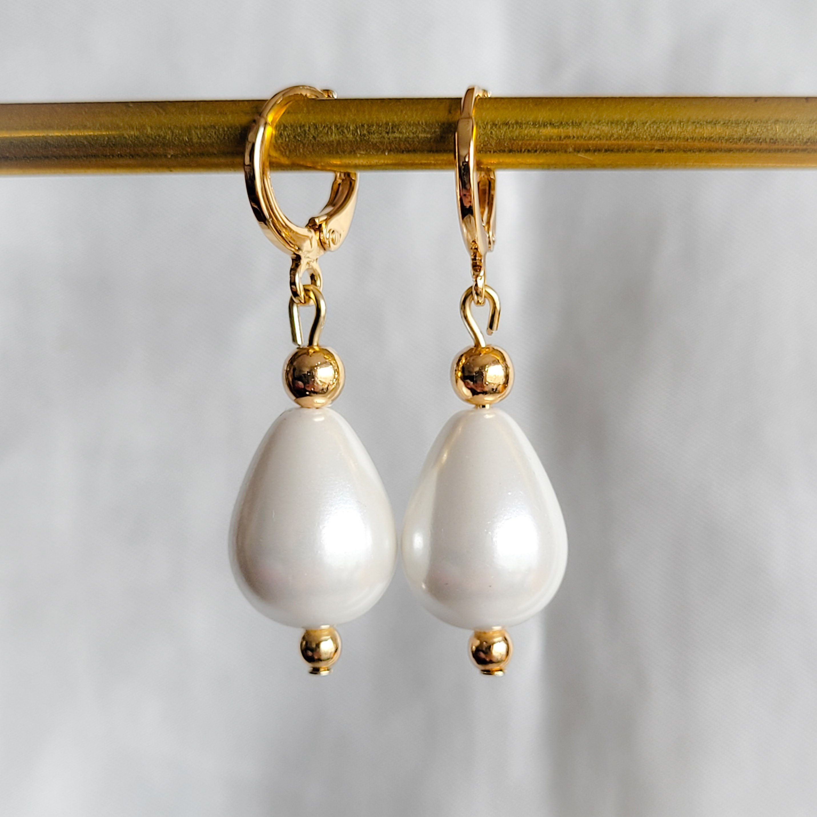 Boucles d'oreilles dormeuses en acier inoxydables dorées agrémentées de perles de nacre et d'hématite dorées.