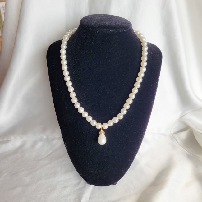 Collier en perles de coquillage de 8 millimètres et une perle goutte de 1,5 centimètres surmontées de cônes en laiton couleur or.