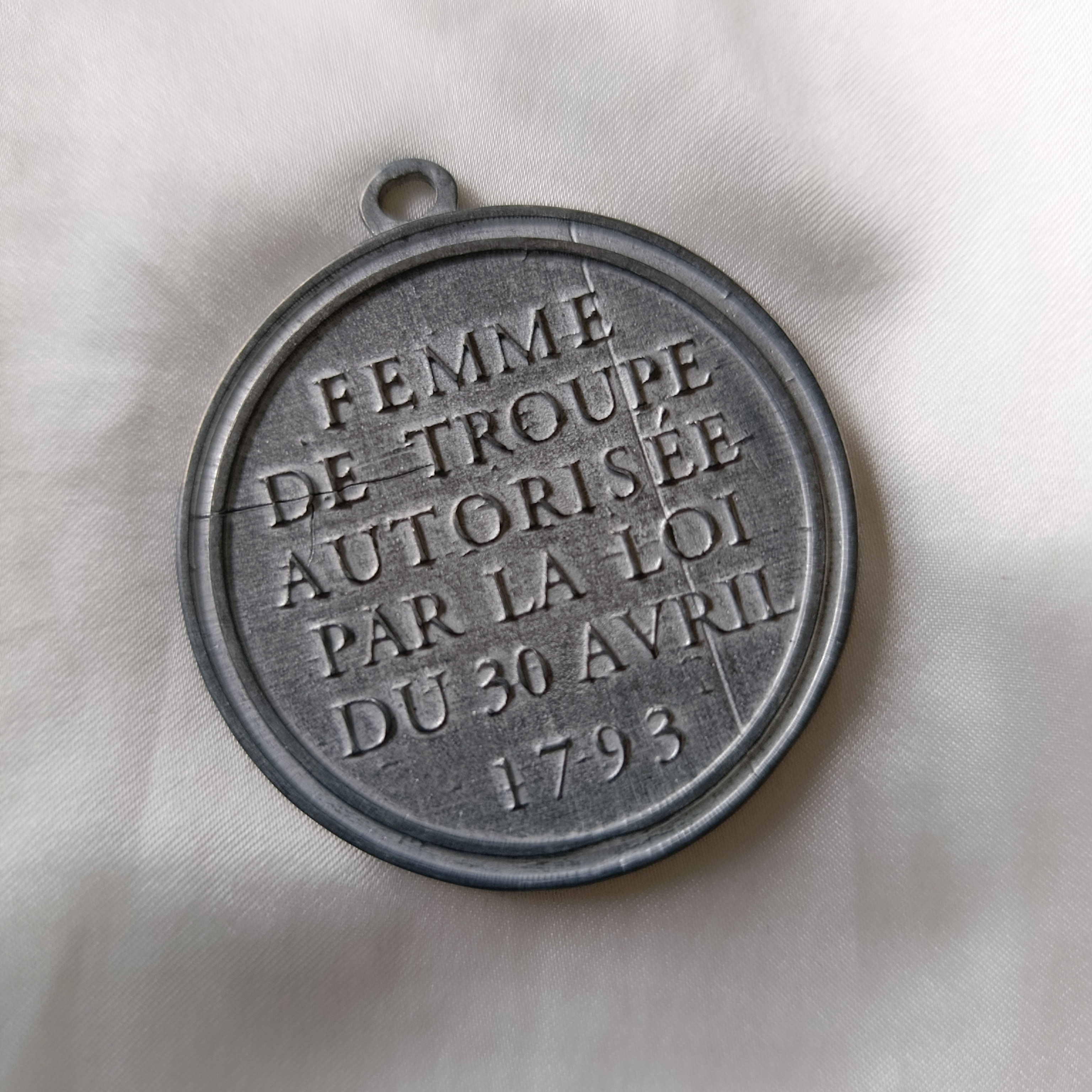 Cette reproduction de médaille de femmes de troupes en étain (comme les authentiques), fabriquée en Italie, est le fruit de plusieurs mois de travail et de recherches. Créée au début de la période après la loi d'avril 1793, cette médaille est donnée à toutes les femmes de troupes pour rendre leur présence officielle au sein de l'armée. Il est fort probable que les plus anciennes femmes de troupes aient portés cette médaille même sous l'Empire.