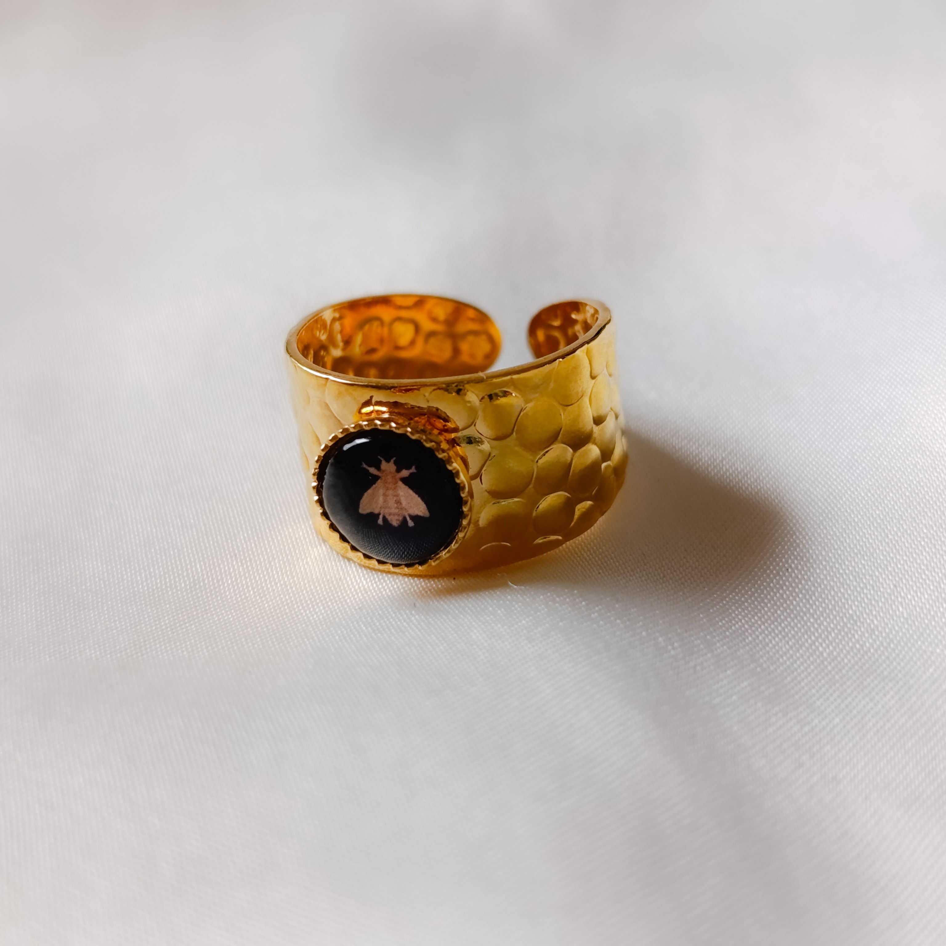 Bague, dorée à l'or fin, surmontée d'un globe de verre de 8 millimètres. L'image utilisée pour la création est une image créee par L'Abeille.